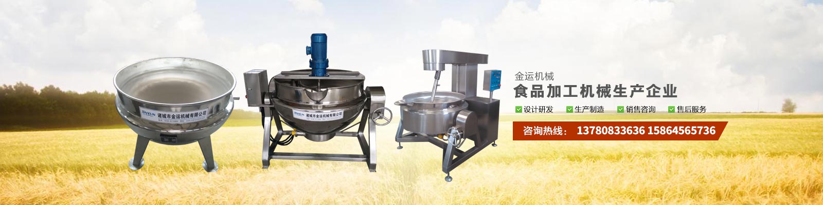 主要產品有:行星攪拌夾層鍋、夾層鍋、壓力煮鍋、各種餡料炒鍋、殺菌鍋(殺菌釜)、巴氏殺菌機、清洗流水線、風干線、真空包裝機、滾揉機、斬拌機、鹽水注射機、大蒜脫皮機、大蒜分瓣機等,廣泛應用于各種食品加工、食品殺菌及農產品深加工、化工、醫(yī)藥的生產等。可滿足外資企業(yè)、合資企業(yè)及國內大中小企業(yè)生產需求,產品暢銷全國各地。
